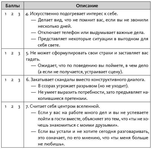 Главное для выяснения типа привязанности спутника не бояться высказывать свои потребности, мысли и чувства! (Подробнее о конструктивном общении в главе 11.) Вступая в отношения, мы устанавливаем цензуру для самих себя: боимся показывать свои желания и раньше времени о чем-то спросить. А ведь эта лакмусовая бумажка укажет на качества избранника. Реакция в реальном времени красноречивее любых слов.