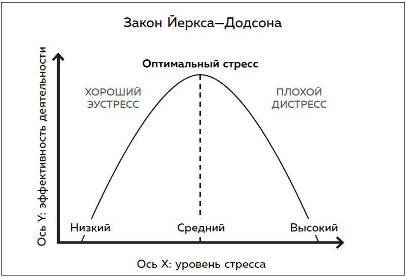 Если бы можно было остаться в этой точке навсегда, все было бы великолепно. Но проблема заключается в том, что даже подобное оптимальное количество стресса начинает все дальше толкать нас, если мы испытываем его на протяжении достаточно долгого времени, и мы начинаем катиться вниз по графику, где эустресс переходит в дистресс.