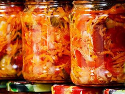 Горячий салат разложить по банкам. Закатать или закрутить. Перевернуть и укутать.