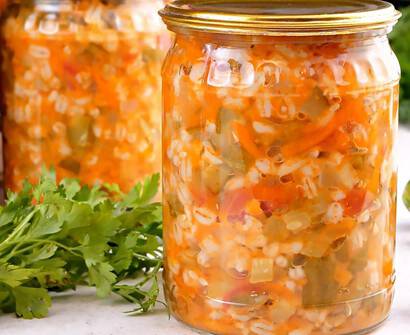 Лук нарезаем полукольцами. Морковь натираем на крупной терке. Перловку отвариваем до полуготовности. Огурцы натираем на терке или нарезаем кубиками.