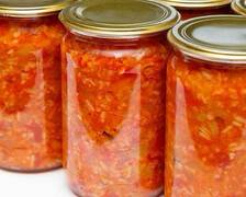 Перец нарезаем кубиками. Репчатый лук нарезаем кубиками и обжариваем на растительном масле. Чеснок пропускаем через пресс. Петрушку мелко рубим. Острый перчик нарезаем колечками.