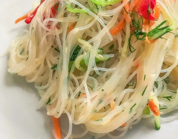 Смешайте фунчозу с овощами. Добавьте специи и чеснок. Заправьте растительным маслом.