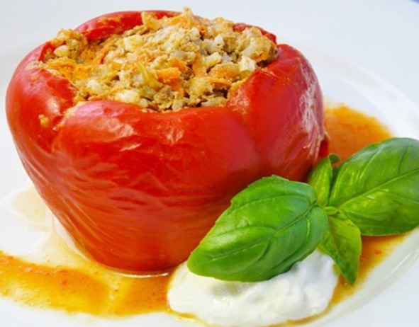 Нам понадобится:На 8 болгарских перчиков, очищенных от семян – 400 гр. Фарша;100 гр. Отварного риса;1 морковь, натертая на мелкой терке, и луковица, нарезанная кубиками;2 ст. л. Томатной пасты;Соль и черный молотый перчик;0,5 пучка зелени укропа, мелко рубленного;Сметана;Растительное масло.