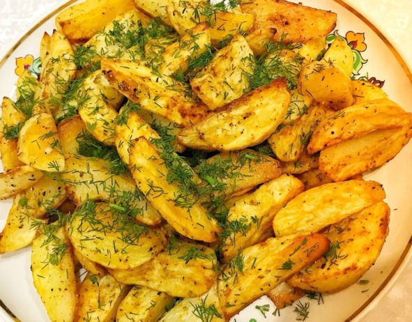 Нам понадобится:2 крупные картофелины, нарезанные на дольки;1 ч. л. Сухого чеснока;1 ч. л. Сухого лука;Соль и черный молотый перчик;Оливковое масло;50 гр. Пармезана.