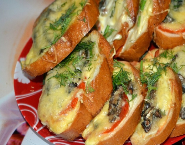 Нам понадобится:Батон круглый, нарезанный;Банка шпрот;Майонез;Сыр, натертый на мелкой терке;Чеснок, пропущенный через пресс;1—2 помидора, нарезанные кружочками.