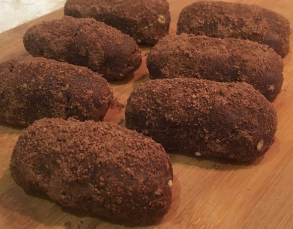 Из полученной массы формируем шарики или овалы. Затем обваливаем пирожные в смеси оставшегося печенья и какао-порошка. Убираем пирожные в холодильник минимум на час.