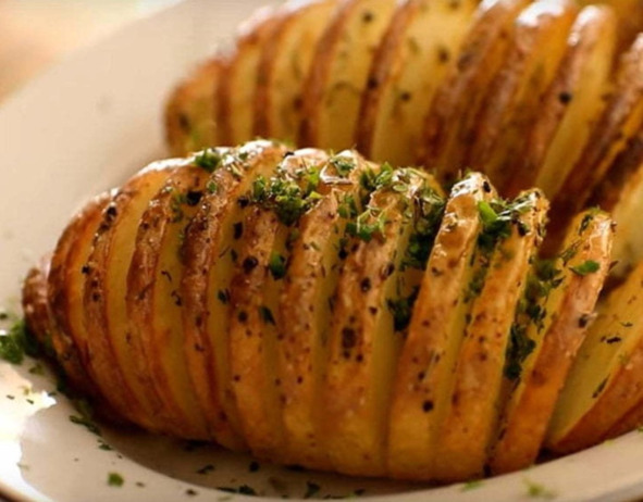 Подготовленный очищенный картофель нарезаем тонкими ломтиками, но не до конца, оставляя небольшую часть целой. Можно положить картофелину на ложку или зажать между двумя палочками для суши.