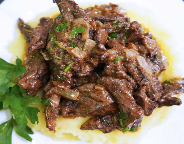 Нам понадобится:500—600 гр. Говяжьей печени, нарезанной полосками;250 гр. Сметаны 25%;100 гр. Репчатого лука, нарезанного полукольцами;2—3 ст. л. Муки;Соль и черный молотый перчик;100 мл. Воды комнатной температуры;Растительное масло.