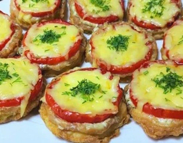 Готовые кабачки смазываем майонезом, сверху кладём кружочек помидора, затем ещё один кабачковый кружок. Сверху смазываем майонезом и посыпаем измельчённым зелёным луком.