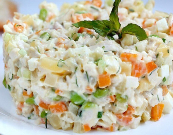 Нам понадобится:200 гр. Куриного филе, нарезанного кубиками;100 гр. Консервированного горошка;4 отварных яйца, нарезанные кубиками;1 красное яблоко, нарезанное кубиками;1 морковь, нарезанная кубиками;Соль;Майонез.