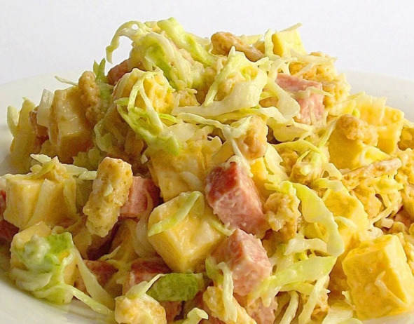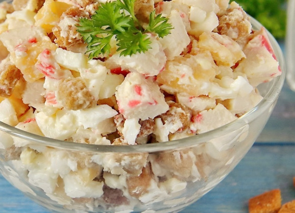Нам понадобится:Маленькая упаковка крабовых палочек, нарезанных кубиками;300 гр. Твердого сыра, нарезанного кубиками;4 отварных яйца, нарезанные кубиками;1—2 пачки сухариков;3—4 зубчика чеснока, пропущенные через пресс;Майонез.Смешиваем все компоненты. Всыпаем в смесь сухарики.Добавляем майонез и тщательно перемешиваем.Приятного вам аппетита!
