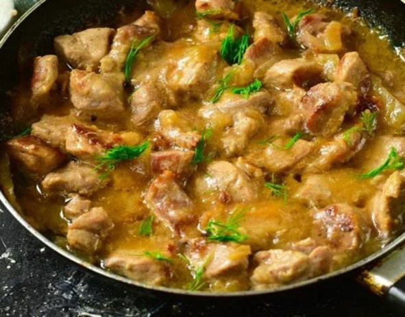Нам понадобится:400 гр. Свинины, нарезанной кубиками;1 луковица, нарезанная полукольцами;2 ст. л. Томатной пасты;1 ст. л. Муки;2 лавровых листа;1 зубчик чеснока, пропущенный через пресс;0,5 ч. л. Майорана;Растительное масло;Соль и черный молотый перчик.