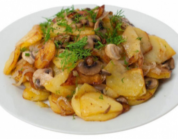 Нам понадобится:250 гр. Шампиньонов, нарезанных кубиками;Луковица, нарезанная кубиками;Перья зеленого лука мелкорубленные;Масло растительное;Вода;5 картофелин, нарезанных кубиками;Приправа для картофеля;Грибной кубик приправ;Соль и черный молотый перчик.