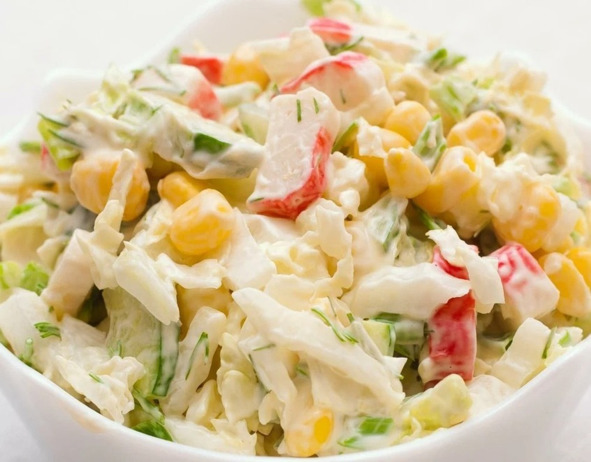 Нам понадобится:1 упаковка крабовых палочек, нарезанных кубиками;3—4 отварных яйца, нарезанные кубиками;1 большой огурец, нарезанный кубиками;5—6 перышек зеленого лука и 7 веточек укропа мелкорубленные;1 баночка консервированной кукурузы;Сметана;Соль и черный молотый перчик.