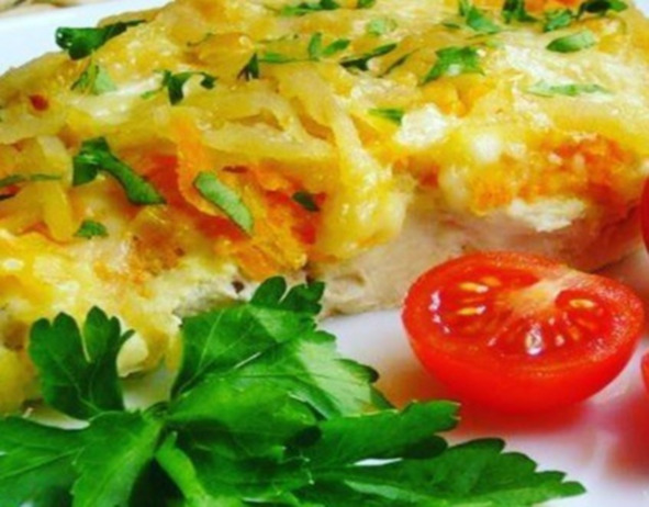 Обжаренную с двух сторон рыбу выкладываем на тарелку, а сверху кладём морковь.