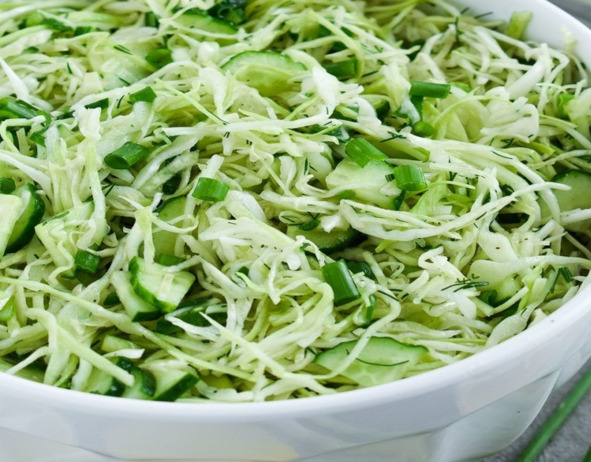 Нам понадобится:100 гр. Белокочанной капусты, тонко нашинкованной;1 свежий огурец, нарезанный тонкой соломкой;1 стебель сельдерея мелкорубленного;Половинка зеленого или желтого яблока, нарезанного тонкой соломкой;ЗАПРАВКА: 2 ст. л. Растительного масла;1 ч. л. Соевого соуса;Щепотка сахара;1 ч. л. Яблочного уксуса;Соль – по вкусу.