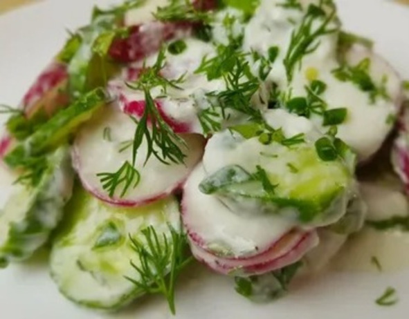 Нам понадобится:120 гр. Малосольных огурцов, нарезанных мелкими кубиками;100 гр. Твердого сыра, натертого на терке или нарезанного мелкими кубиками;Маленькую упаковку густых сливок;80 гр. Консервированного зеленого горошка;5 гр. Перьев зеленого лука мелкорубленного;5—6 редисок, нарезанных тонкими пластинками.