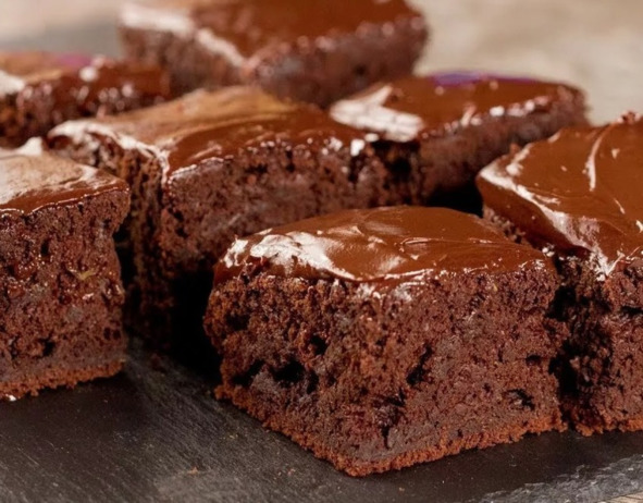 Готовый корж вынимаем из духовки. Даём ему немного остыть и поливаем оставшейся шоколадной смесью. Нарезаем корж на квадраты.