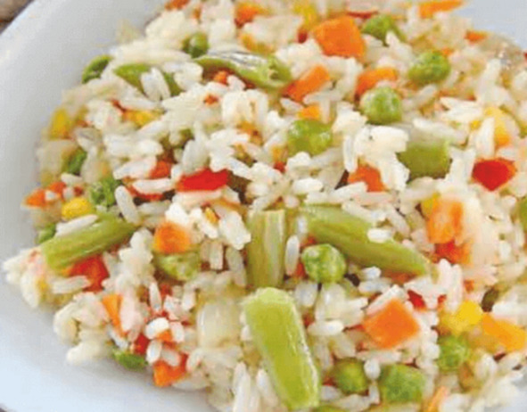Нам понадобится:200 гр. Риса;100 гр. Кукурузы;100 гр. Зеленого горошка;100 гр. Болгарского перца, нарезанного полосками;3 ст. л. Растительного масла;1 щепотка Карри;1 литр воды;Соль и черный молотый перчик по вкусу.