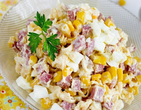Нам понадобится:100 гр. Копченой колбасы, нарезанной кубиками;100 гр. Сыра, натертого на терке;Банка консервированной кукурузы;3 отварных яйца, нарезанные кубиками;1—2 зубчика чеснока, пропущенные через пресс;Майонез.