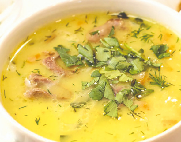 Из луковицы делаем зажарку и также добавляем её в суп. После этого кладём в суп натёртые сырки. Варим суп ещё 15—20 минут, пока сыр полностью не растворится и картофель не станет мягким.