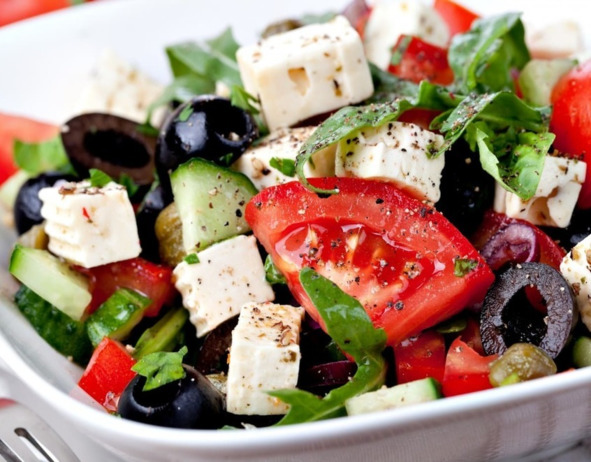 Нам понадобится:2—3 средних томата, огурец, болгарский перчик, красная луковица нарезанные крупными кубиками;100 гр. Мягкого сыра, нарезанного кубиками;55 гр. Черных маслин;0,5 ч. л. Орегано;3,5 ст. л. Оливкового масла;Щепотка соли;Кунжут;Литья салата нарезанные крупно.