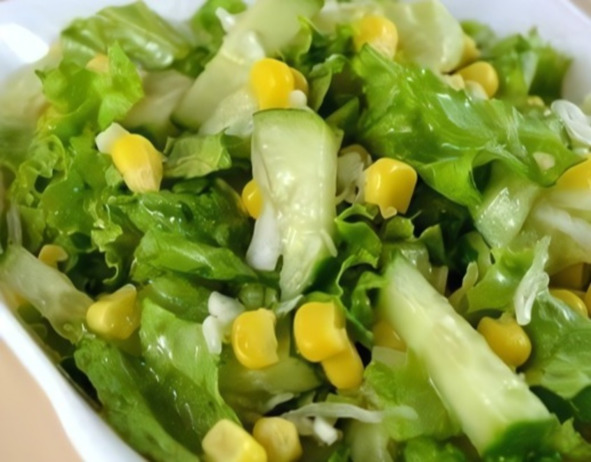 Нам понадобится:150 гр. Консервированной кукурузы;2 яйца отварных, нарезанные кубиками;100 гр. Свежих огурцов, нарезанных соломкой;100 гр. Твердого сыра, натертого на мелкой терке;Зеленый лук мелкорубленный;Майонез;Соль.