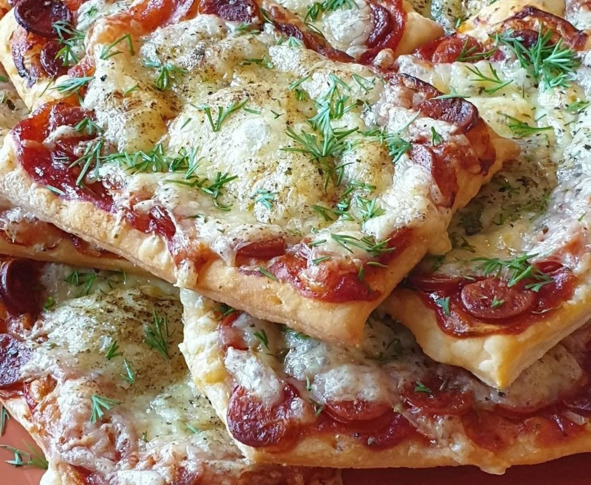 Нам понадобится:500 гр. Слоеного теста;200 гр. Салями, нарезанной тонкими кружочками;По желанию 200 гр. Шампиньонов, нарезанных пластинками;0,5 луковицы, нарезанной полукольцами;150 гр. Твердого сыра, натертого на мелкой терке;2 помидора, нарезанных кружочками;Зелень укропа мелкорубленная;5 ст. л. Кетчупа;0,5 ч. л. Итальянских трав;Соль и черный молотый перец.