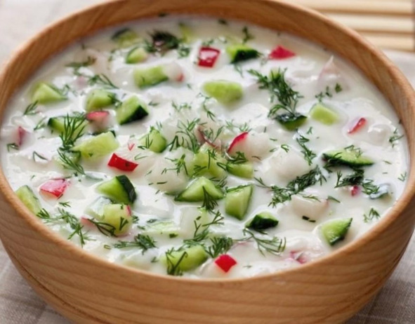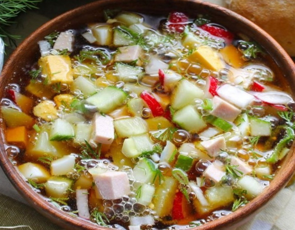 Нам понадобится:Квас;300 гр. Отварного мяса говядины или ветчины, нарезанное кубиками;3—4 огурца, натертые на терке;4 отварных картохи, натертые на терке;4—5 отварных яиц, натертых на терке;Зеленый лук и укроп мелкорубленные;Сметана;Соль и черный молотый перчик – по вкусу;Редис, натертый на терке;Горчица – по вкусу.