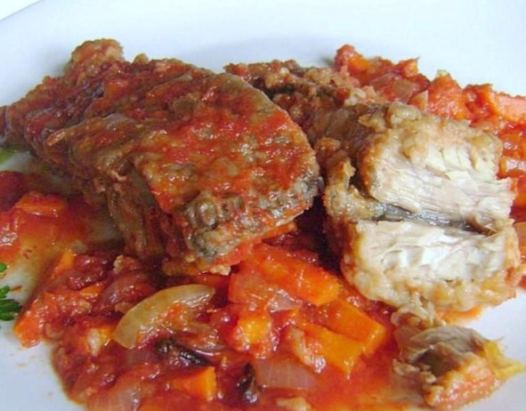 Рыба, тушеная с луком в томатно-горчичном соусе