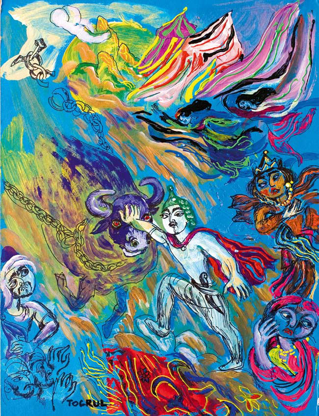 Люди в смятении натыкались друг на друга, а бык сразу помчался на женскую половину, нацелился рогами на красное платье Бурлы-хатун, ринулся прямо на нее. Испуганная девушка прижалась к палатке. Бык совсем было добежал до нее. Все растерялись, стояли, не шелохнувшись.