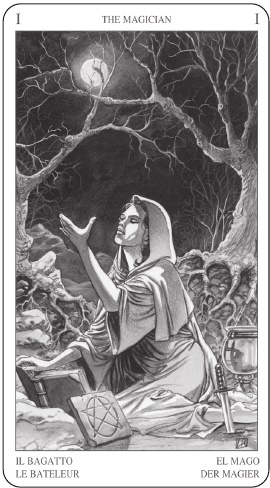Карта Маг в этой колоде соотносится с традиционным изображением в главных деталях: рядом с женщиной, приклонившей колени к земле – её алтарю – разложены магические атрибуты: палочка, чаша, меч и пентакль. На преемственность традиции в магии указывает также книга (Книга памяти), на которой лежит рука колдуньи.