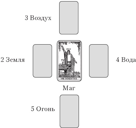 4-й этап. Расклад Крест Стихий. Как мы помним, основой конфигурации карт в Раскладе практической Магии должен быть Магический крест, имитирующий спираль Стихий. Таким образом, основой Расклада должна быть конфигурация из 5 позиций.