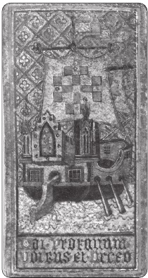 Башня прото-таро. На рисунке из рукописи, условно названной «Геральдический Манускрипт Харлея», датированной 1180 годом, персонаж облачён в белую рубаху, а не в доспехи, что указывает на духовную сторону рыцарства.