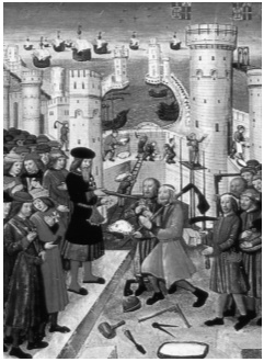 На рисунке из манускрипта архитектор зачитывает план строительства (устав) и распределяет работы. На рисунке изображены инструменты архитектора и строителей, в которых уже просматривается будущая атрибутика масонов: молоток, угольник, лопатка – всё это на фоне башен, лестницы и квадратных гербов с крестами.