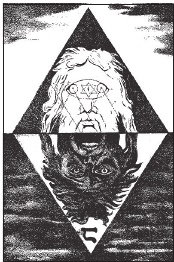 Линии на лике идут наискосок, указывая на «обратное» отражение (правое становится левым, а левое – правым, чёрное – белым, а белое – чёрным). Лоб украшен гексограммой, что символизирует «созидающий разум». Отражение шестиугольника внизу Леви отметил еврейской буквой Тав, расшифровав рисунок так: «Число шесть – это число антагонизма и борьбы как этапа подготовки к окончательной сборке воедино, и ему соответствует буква Вав, символ созидающего лингама и серпа жнеца».
