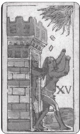 Подобную картину изгнания из Рая можно увидеть, например, на соответствующей карте из колоды Минкьяте 1806 года. Карта из поздней версии колоды Минкьяте идёт под номером 15, а не 16, как положено в «классическом» Таро.