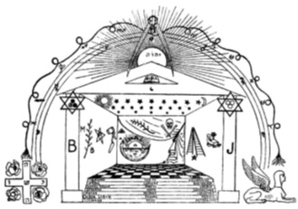 Ложа масонов. На иллюстрации из эссе Папюса «Генезис и анализ масонских символов» запечатлён план убранства масонской Ложи с разнообразными символическими шифрами и атрибутами.