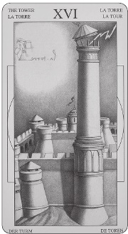 Так, на карте XVI Аркана изображена та же композиция с башней, устоявшей под ударом молнии, представляющая собой как бы небесную матрицу земной башни (вверху слева).