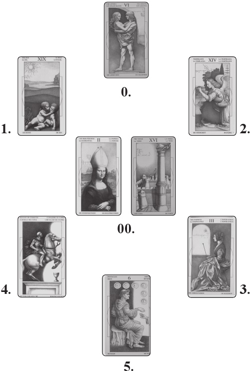 Расклад-пантакль в нашем примере имеет форму мандалы: он состоит из двух крестов – прямого и косого, что необходимо для практической работы с Арканами третьей группы, к которой относится Башня.