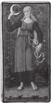 Познание в призме Луны. Возможно, прообразом персонажа Луны из Таро Висконти-Сфорца (Пирпойнт-Морган Бергамо) послужила Исида. Эта карта в противовес Дьяволу и Башне, «родная» колоде. В иконографии карты есть знаковая деталь. По линии талии фигура женщины разделена на две части верёвочным поясом: на верхнюю и нижнюю. Левой рукой она привлекает внимание к своему поясу, концы которого складываются в примечательную конфигурацию, напоминающую двух змей, таких же, как на кадуцее Гермеса. Несомненно, это не случайный изыск художника.