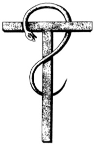 В средневековье символический посох часто изображался в виде жезла с крестообразным навершием, обвитым змеёй.