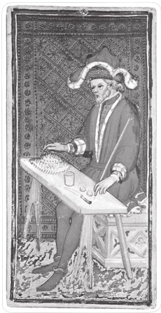 Маг Висконти-Сфорца. На карте Таро Висконти-Сфорца (Пирпойнт-Морган Бергамо) ухоженный мужчина в богатой одежде сидит за столиком. Это единственный образец Мага, в котором персонаж находится в сидячем положении. В дальнейшем на всех одноимённых картах персонаж стоит перед столом. Сидит он на золотом резном сундуке. Такой дорогой изысканный сундук намекает на своё драгоценное содержимое. А что может быть ценнее знаний? Кстати, рукописные книги в средневековье ценились зачастую дороже драгоценных камней, а за иную книгу могли отдать виллу или целое состояние.