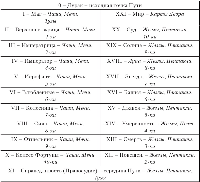 Таблица соотношений Старших и Младших Арканов