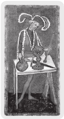 Маг Висконти Кэри-Йель. Возвращаясь к классическому изображению Мага, можно сказать, что четыре традиционных атрибута на его столе – это те же Тузы из колоды Таро. Эти атрибуты хорошо видны на карте из колоды Висконти Кэри-Йель.