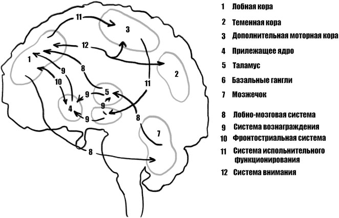 2) Недостаточная активация лобно-стриального и лобно-теменного контуров и других лобных областей мозга.