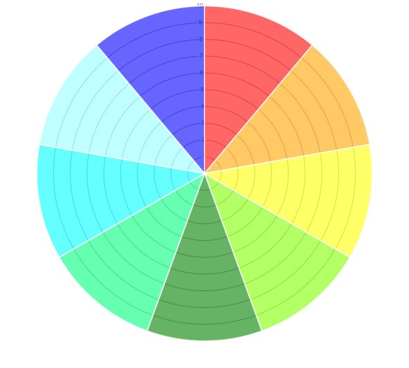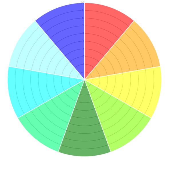 Вы можете назвать сектора по-своему, а для примера вот колесо, которое может быть у вас. Оцените, на каком уровне сейчас вы находитесь в каждом секторе по десятибалльной шкале. Закрасьте соответствующее количество делений.