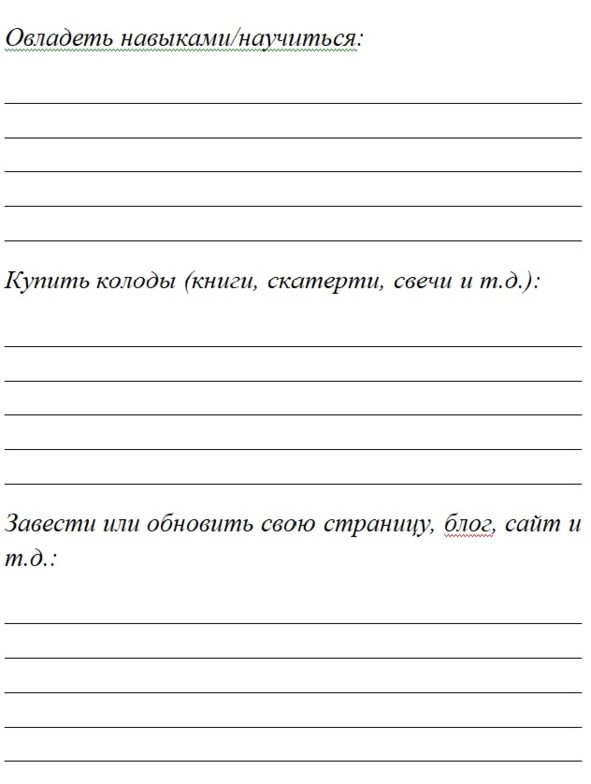 Для наглядности, если хотите, можете нарисовать свой расклад сами, для этого есть место, а можете просто прописать вопросы и рядом с ним пометить какая карта выпала и что она, по-вашему, тут значит. А в конце месяца, заполнить другие страницы, где нужно будет проанализировать полученные ответы уже из прожитой реальности. Таким образом, это и будет наработка вашего опыта.