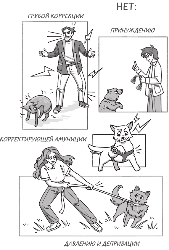 • Мы создаем условия для того, чтобы собака совершила нужные нам действия, и закрепляем их при помощи похвалы, вкусняшек или игры. Если же собака ошибается, мы не ругаем и не наказываем ее. Любое наказание приводит к потере инициативы и разрушению доверительных отношений. По этой же причине в ноузворке запрещено использование корректирующей амуниции – удавок, строгих и электрических ошейников.