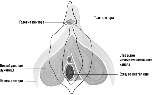 ТЕЛО КЛИТОРА выступает вверх, в таз, и с помощью связок крепится к лобковой кости. От тела клитор раздваивается, образуя парные ножки и вестибулярные луковицы. Эти луковицы проходят позади половых губ, по направлению к анусу. Луковицы и ножки содержат эректильную ткань, которая богато снабжена кровеносными сосудами и увеличивается в размерах во время полового возбуждения. Набухая по обе стороны вагинального канала, луковицы и ножки стимулируют выделение смазки во влагалище, одновременно усиливая сексуальное влечение и подготавливая тело женщины к половому акту. Расширившаяся ткань клитора также может давить на переднюю стенку влагалища и уретру. Из-за этого после оргазма бывает несколько затруднено мочеиспускание.